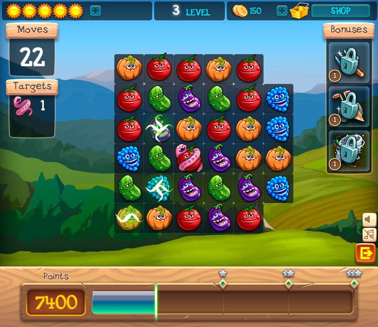 Match together four or more fruits/vegetables of the same kind to create a special bonus objects that can explode in a line or a set radius.